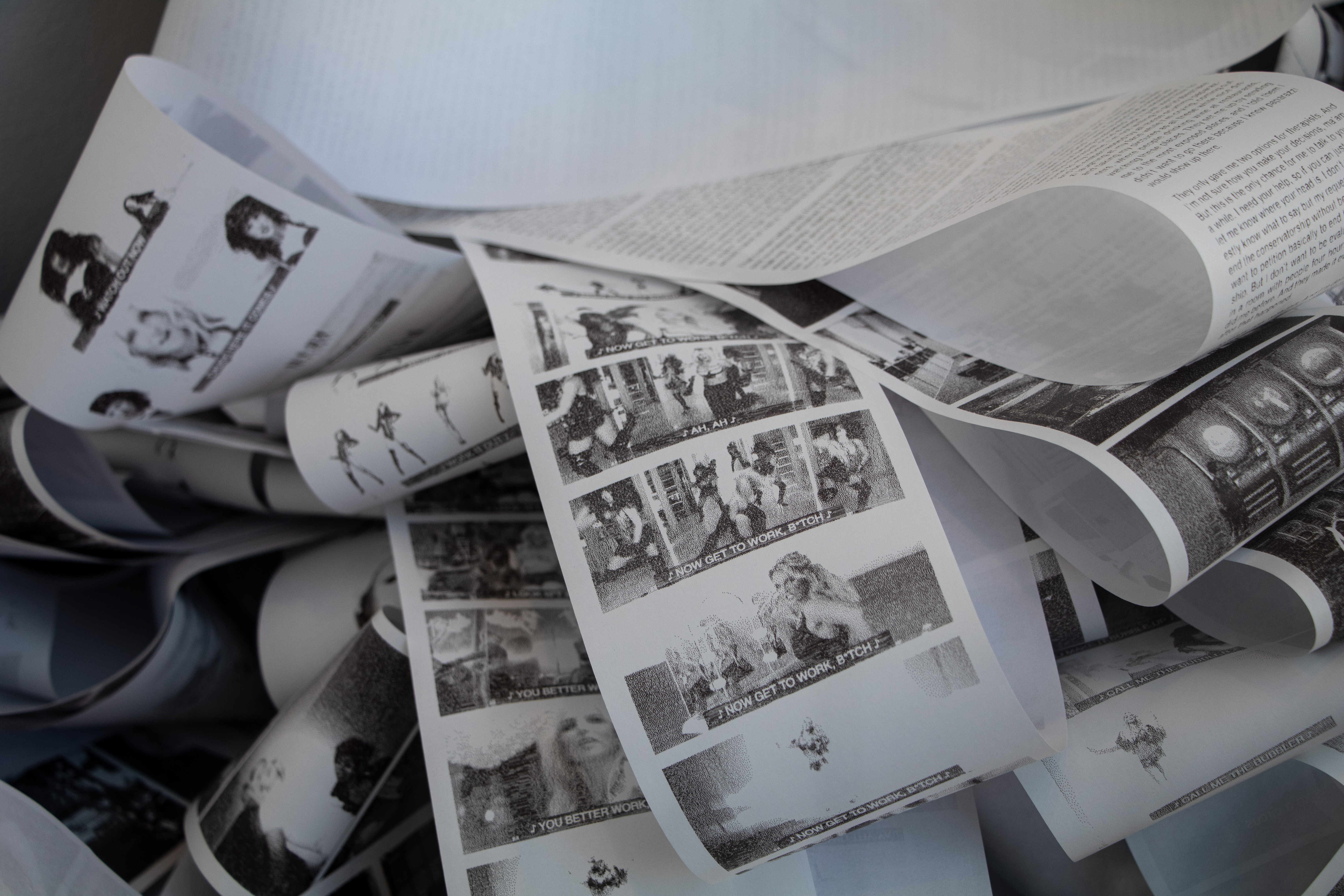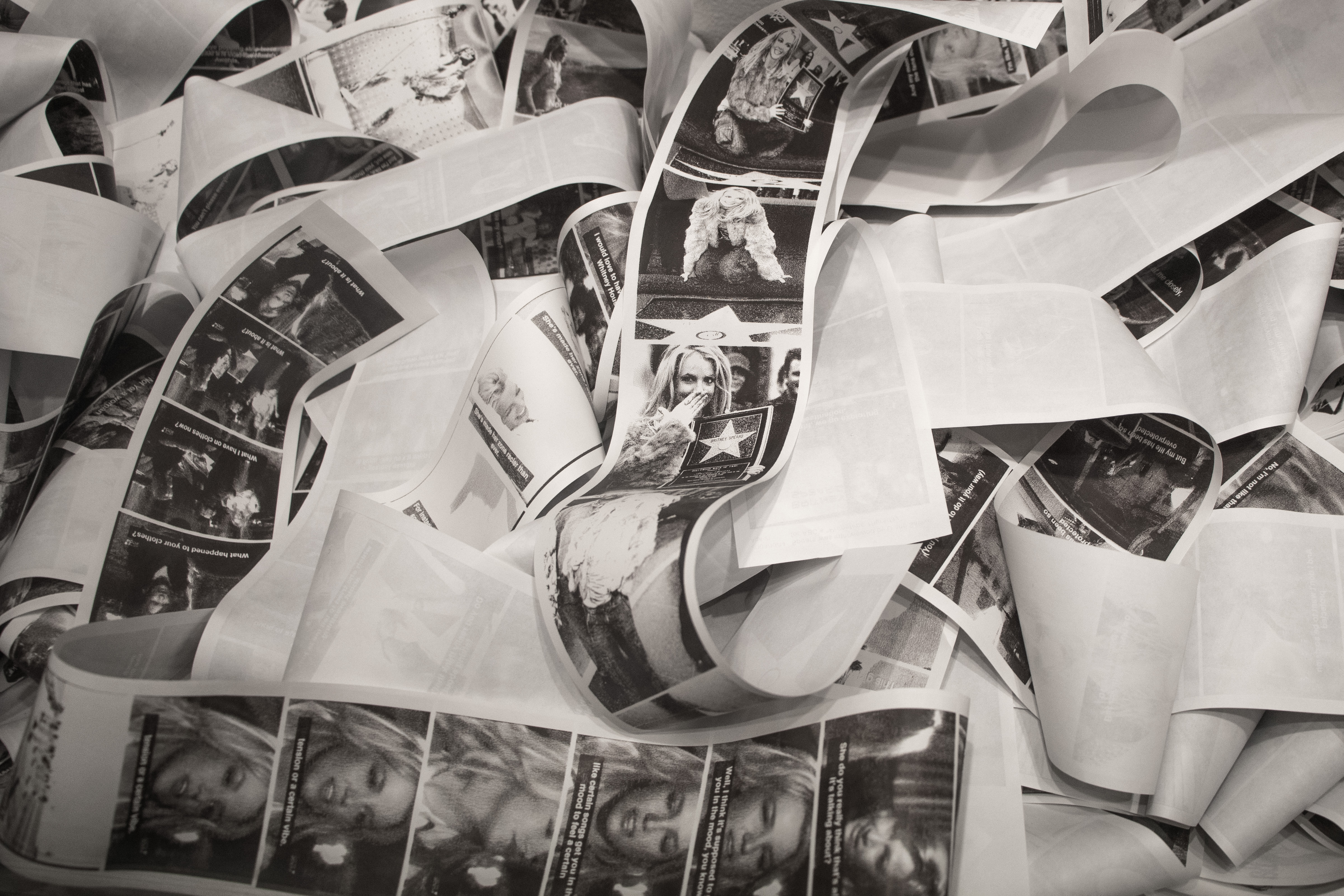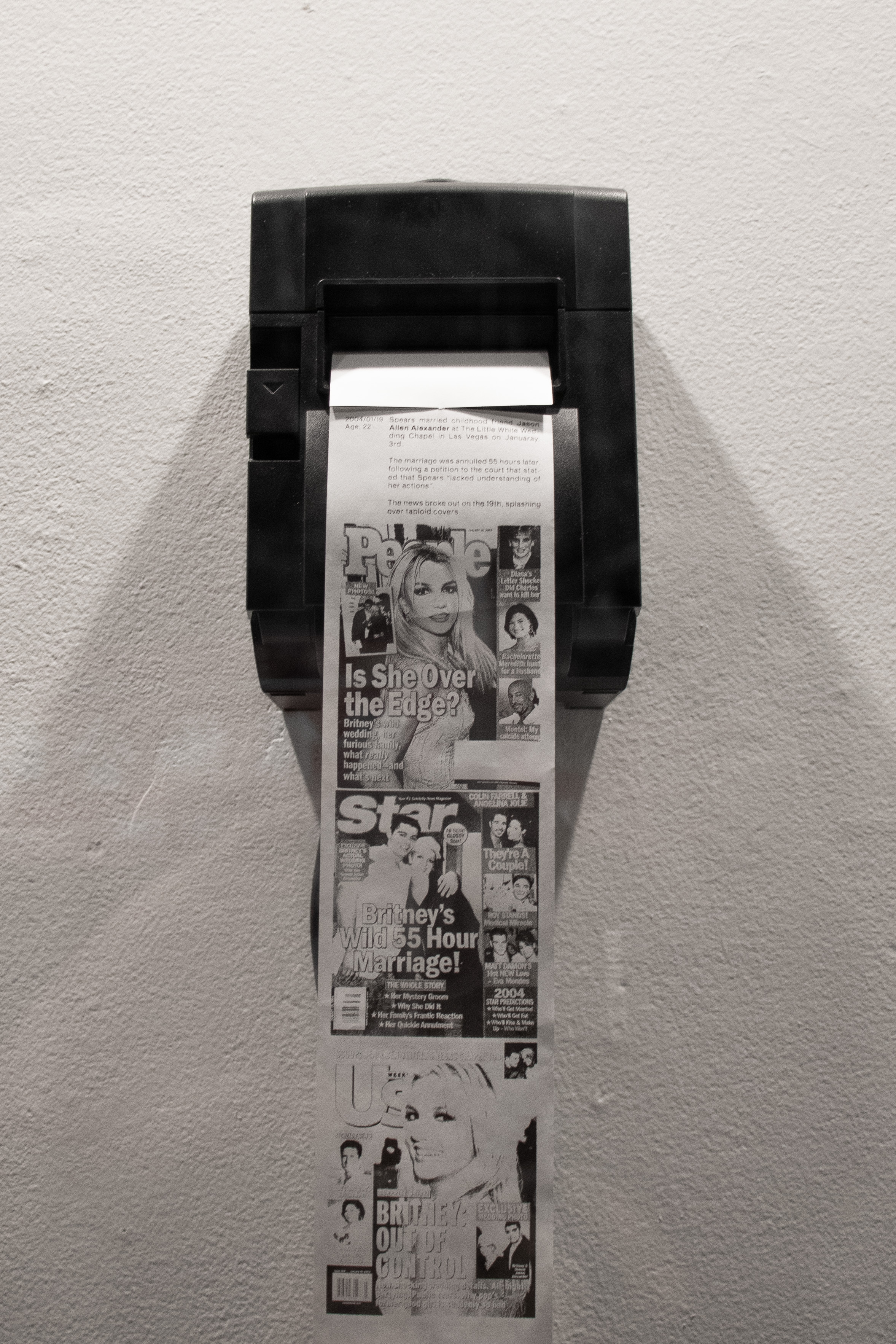 In this durational installation, a hacked receipt printer is programmed to output a chronological record of Britney Spears’s life—spanning from her birth in 1981 to the present day. Over the exhibition, the printer dispenses thousands of screengrabs and fragments drawn from music videos, televised appearances, paparazzi photos, court documents, and social media posts, forming a continuous stream of receipts that accumulate on the gallery floor.