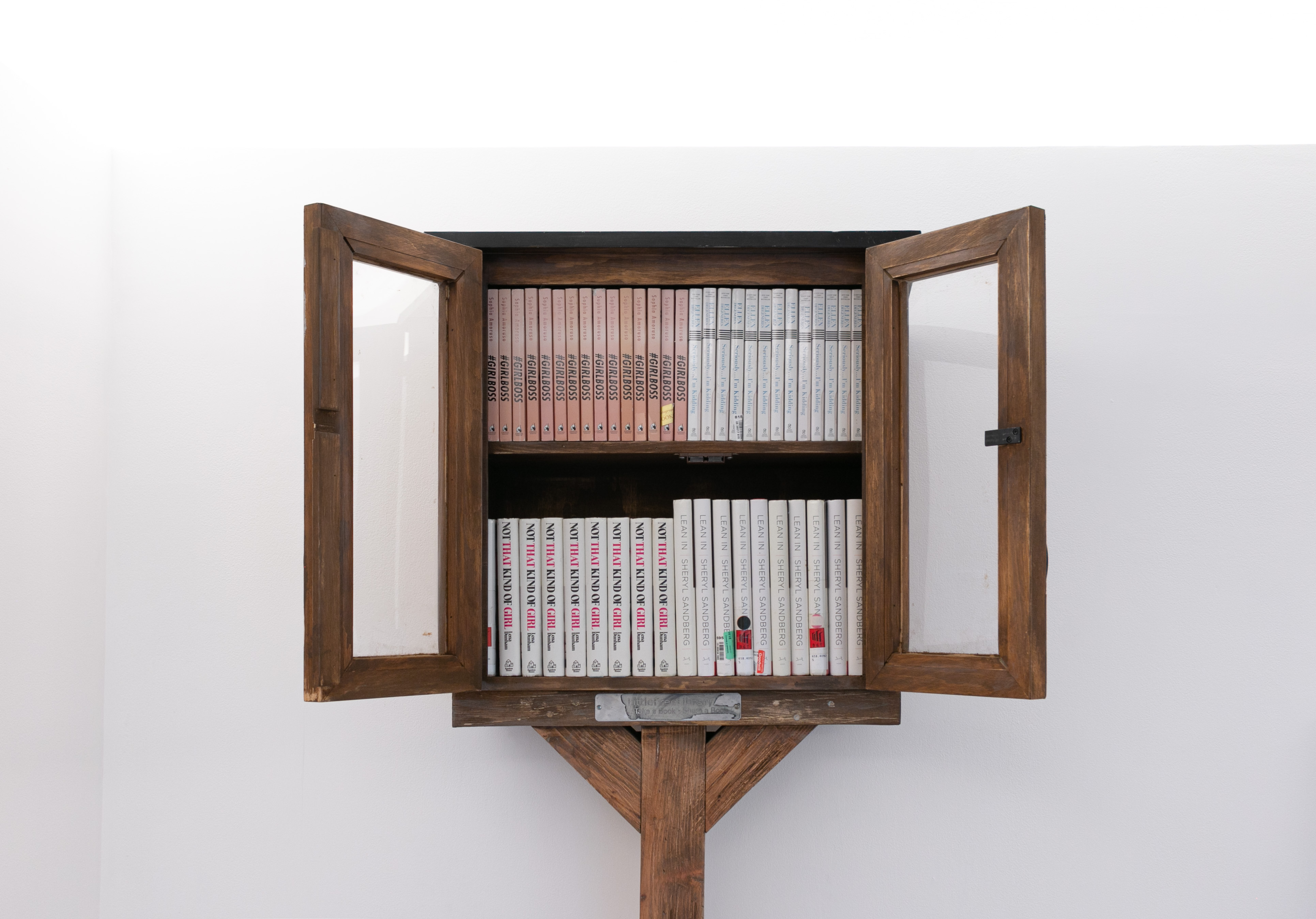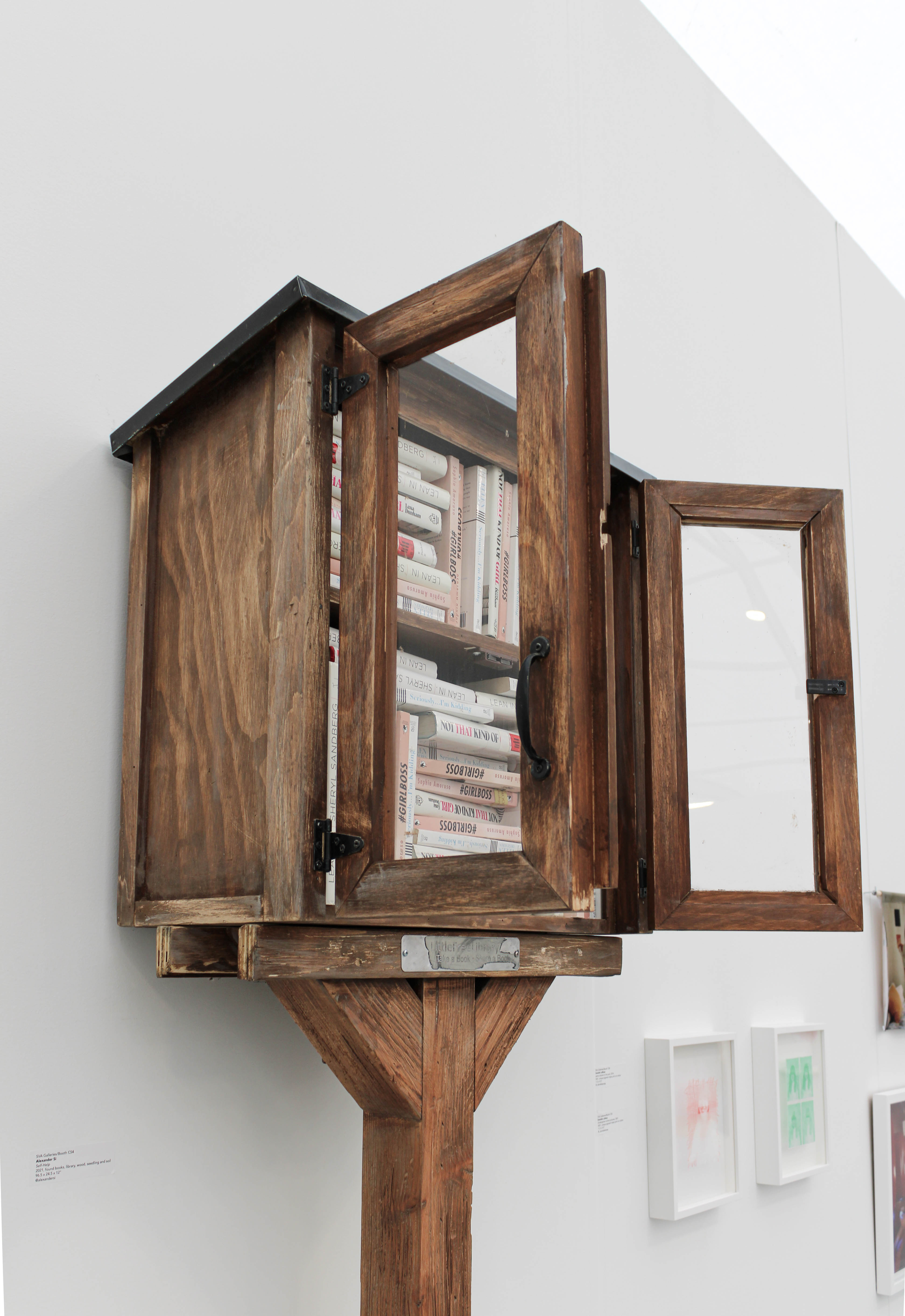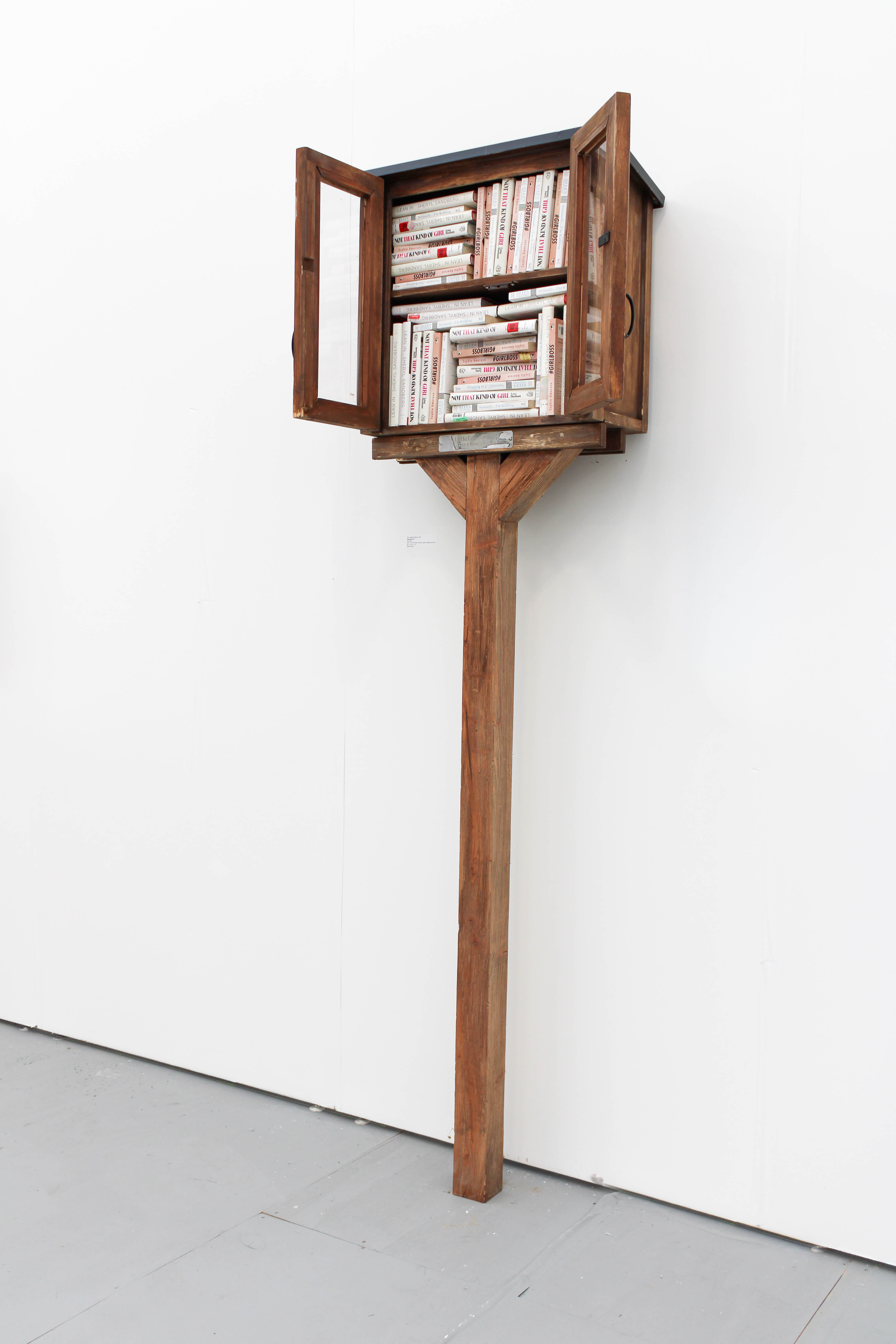 Self-Help presents a six-foot-tall lending library composed of secondhand copies of four once-popular memoirs and advice books: Sophia Amoruso’s Girlboss, Ellen DeGeneres’s Seriously… I’m Kidding, Lena Dunham’s Not That Kind of Girl, and Sheryl Sandberg’s Lean In. All four titles were widely embraced during the 2010s but later faced degrees of cultural critique in the 2020s. Visitors are invited to interact with the sculpture and read the books within the gallery.