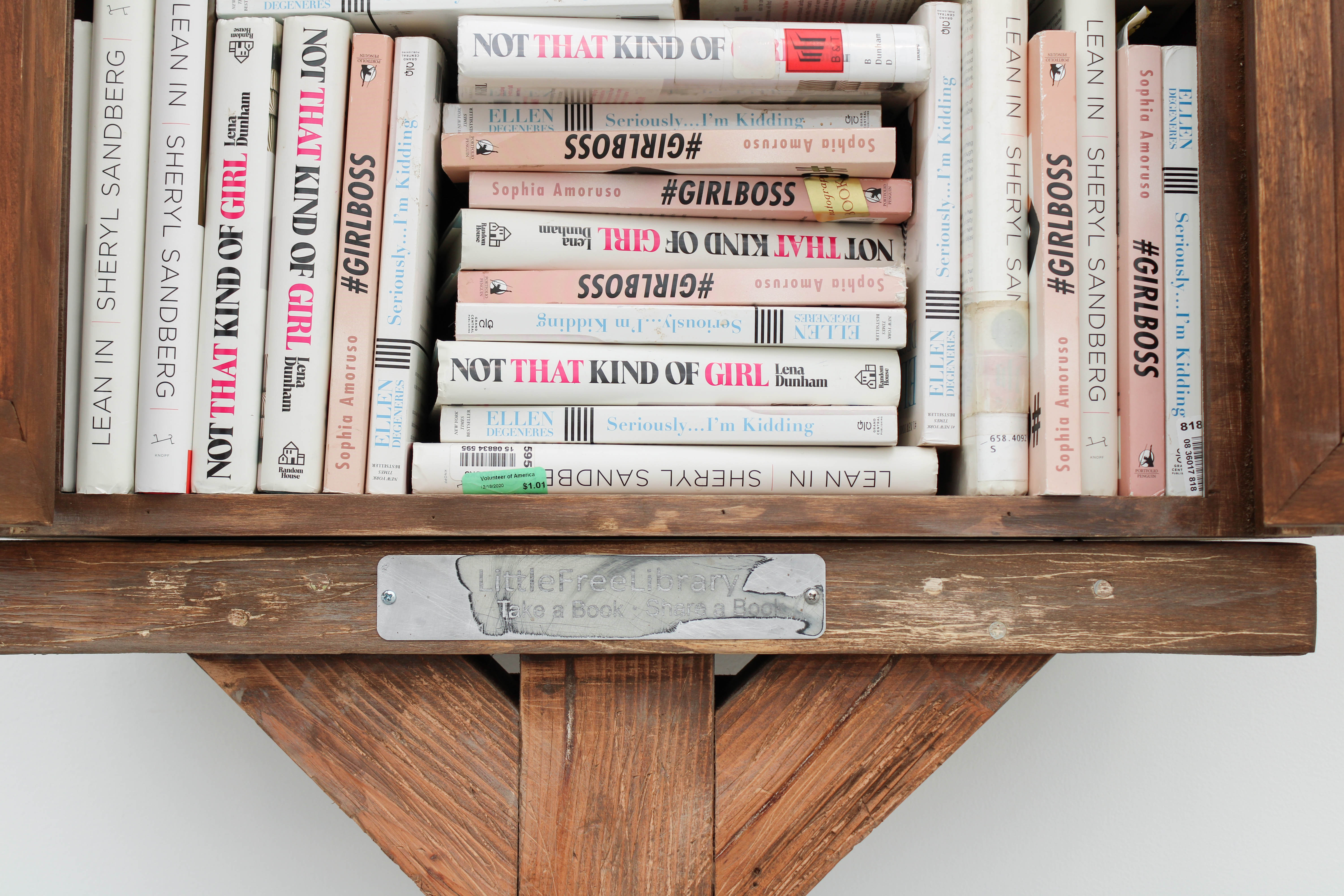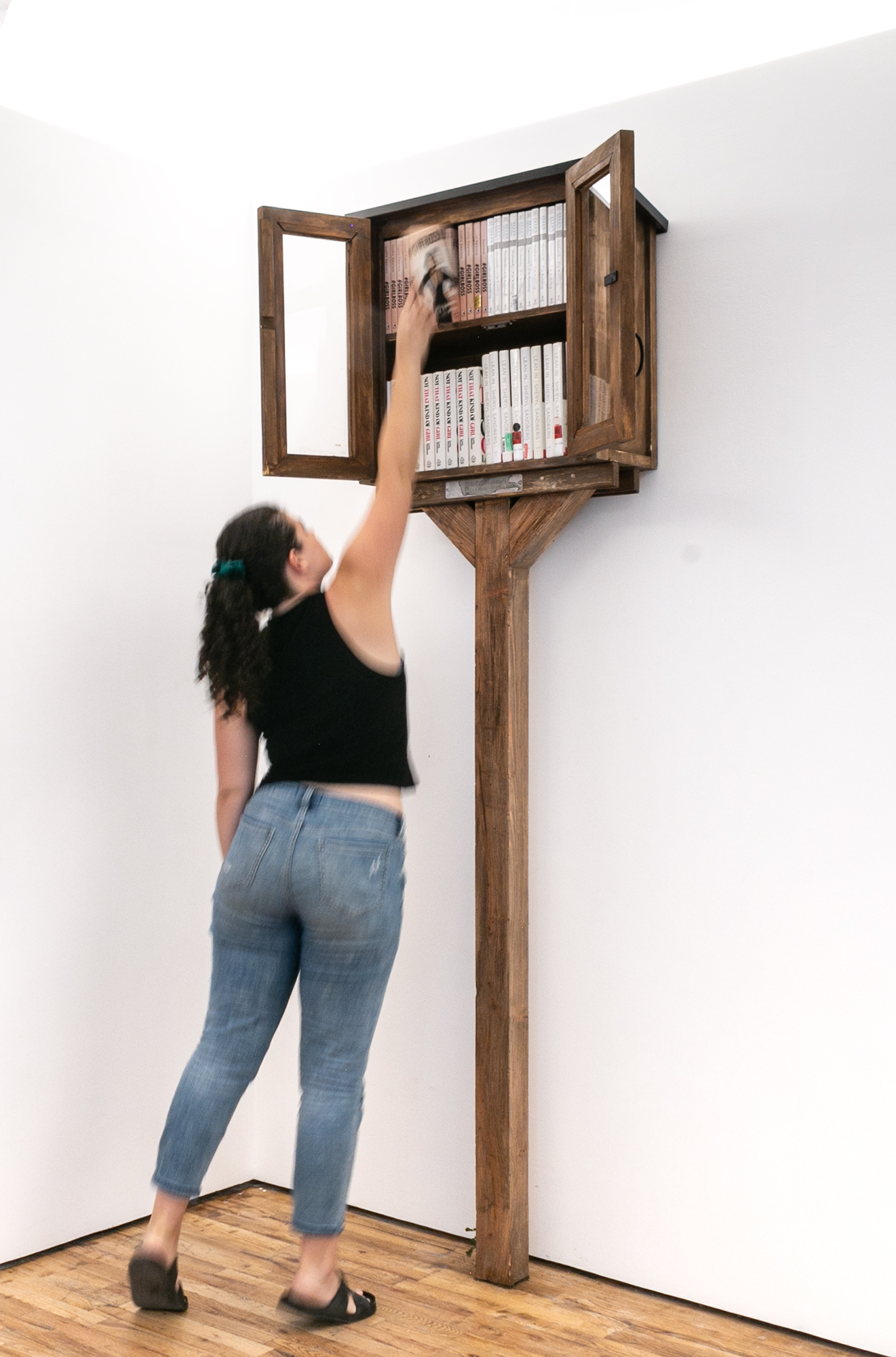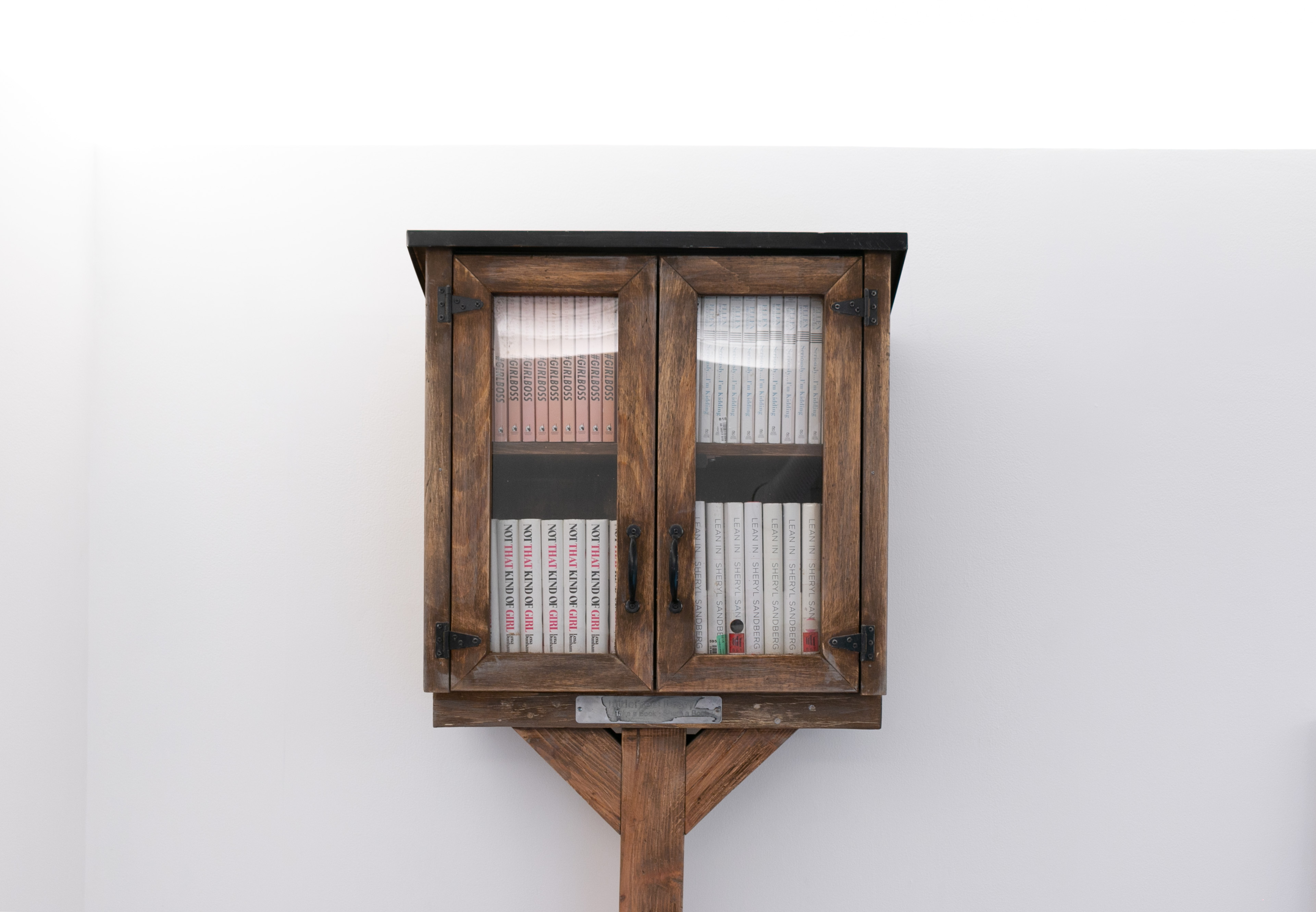 Self-Help presents a six-foot-tall lending library composed of secondhand copies of four once-popular memoirs and advice books: Sophia Amoruso’s Girlboss, Ellen DeGeneres’s Seriously… I’m Kidding, Lena Dunham’s Not That Kind of Girl, and Sheryl Sandberg’s Lean In. All four titles were widely embraced during the 2010s but later faced degrees of cultural critique in the 2020s. Visitors are invited to interact with the sculpture and read the books within the gallery.