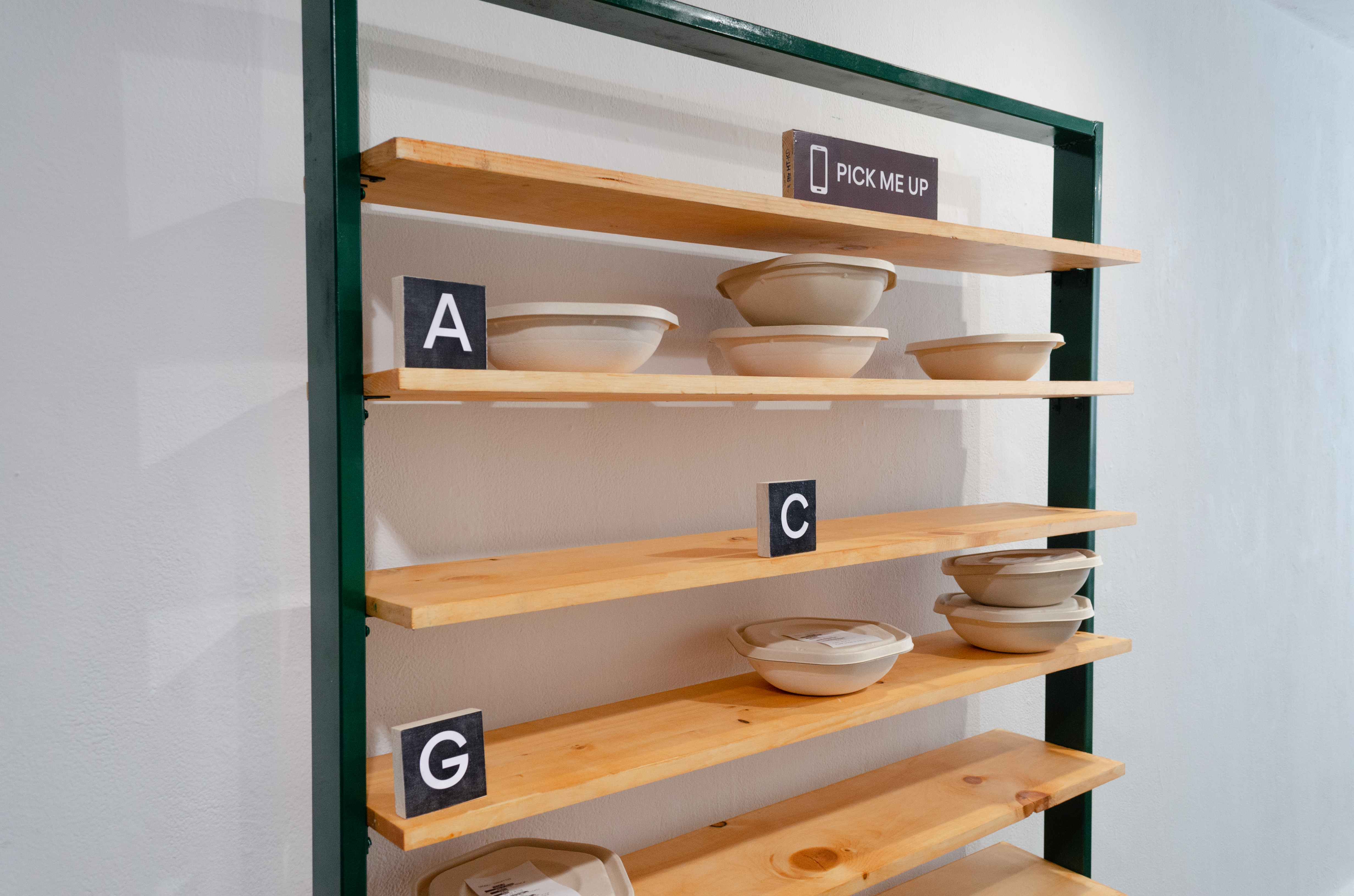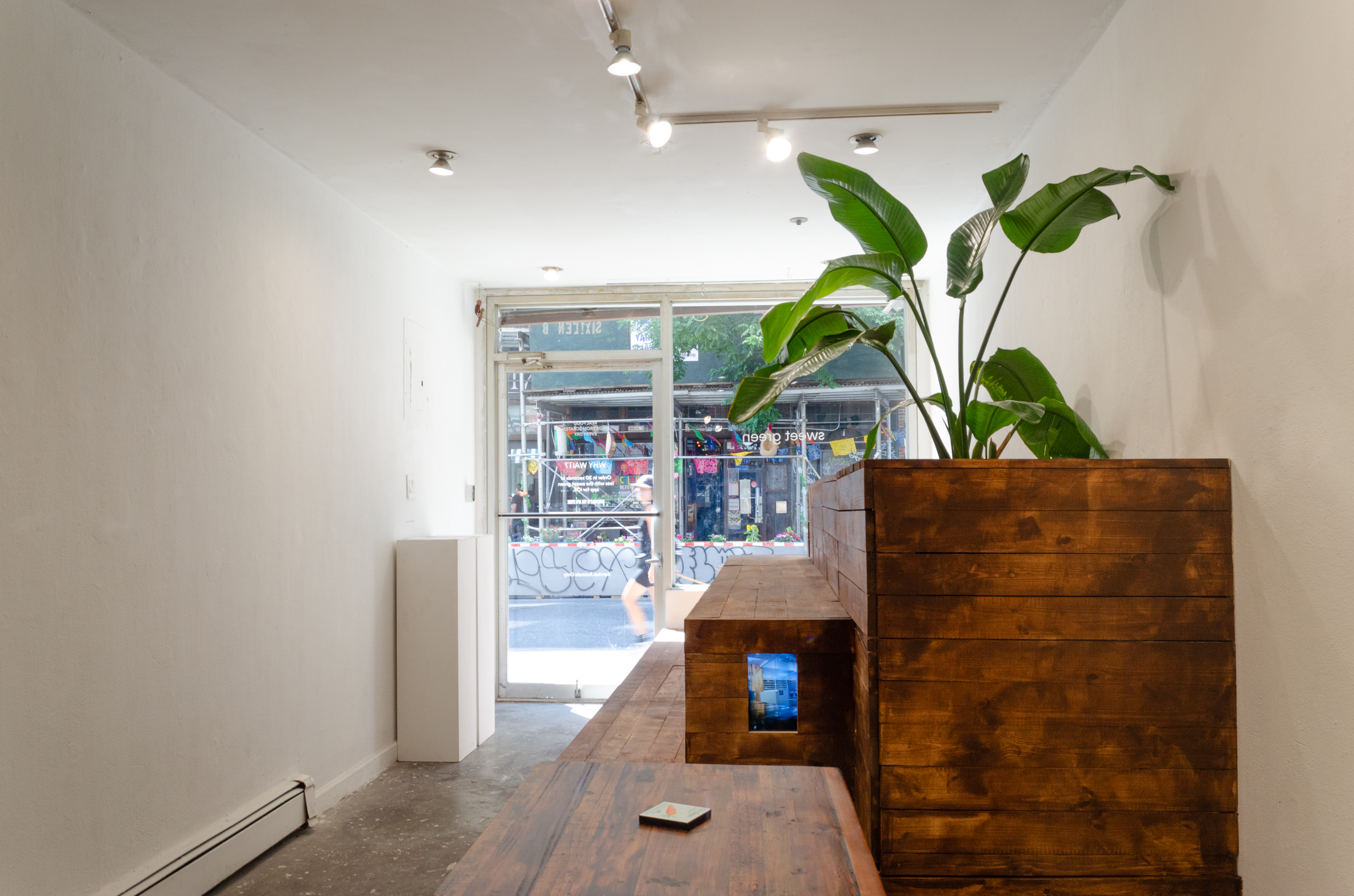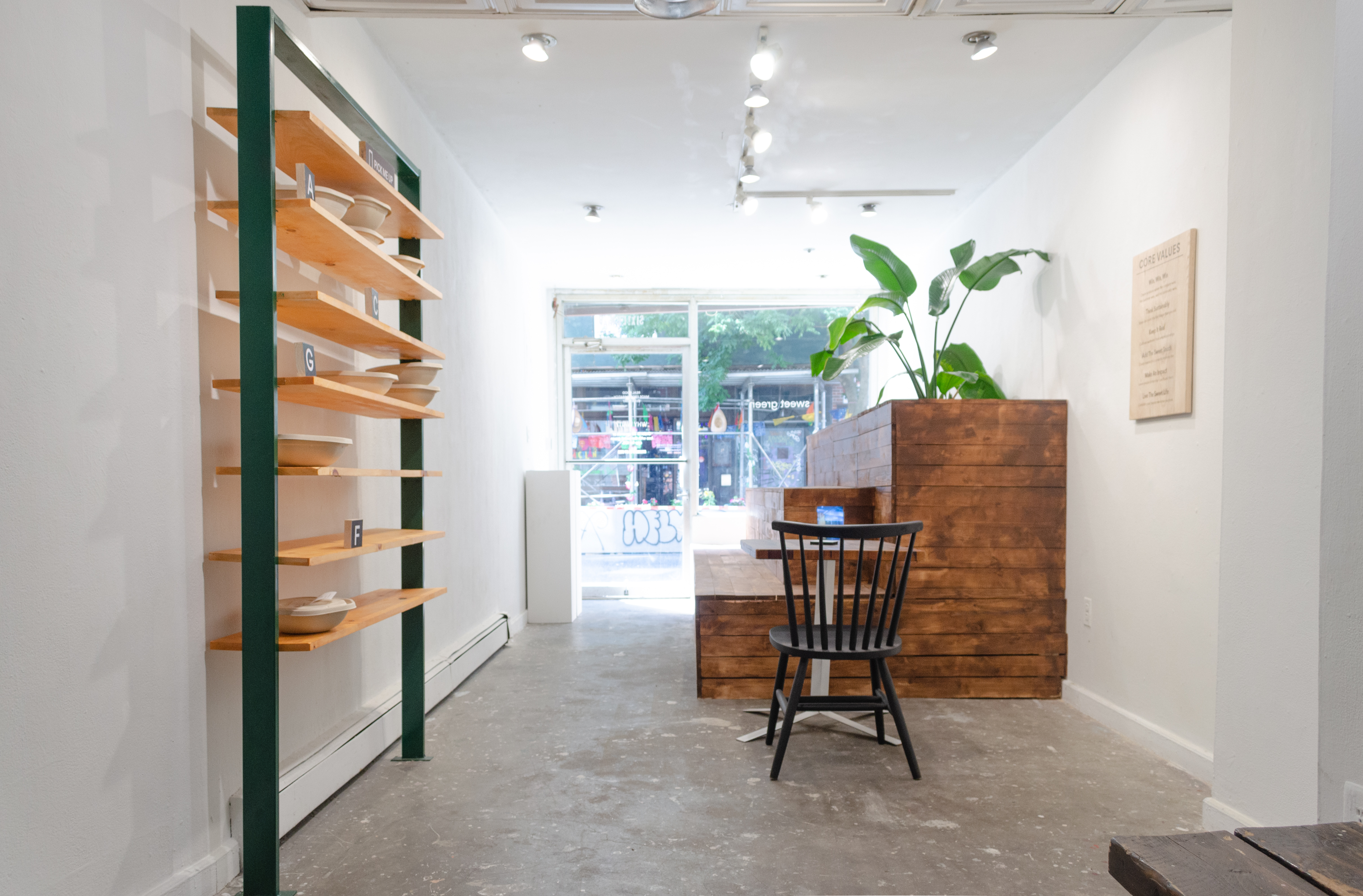 In this immersive installation, a storefront gallery was transformed into a hand‑crafted simulacrum of the Sweetgreen brand, from the “sg” signage and online‑order pickup shelves to communal benches and tables. Every sculptural element—from branding decals to furnishings—was fabricated by the artist’s labor.