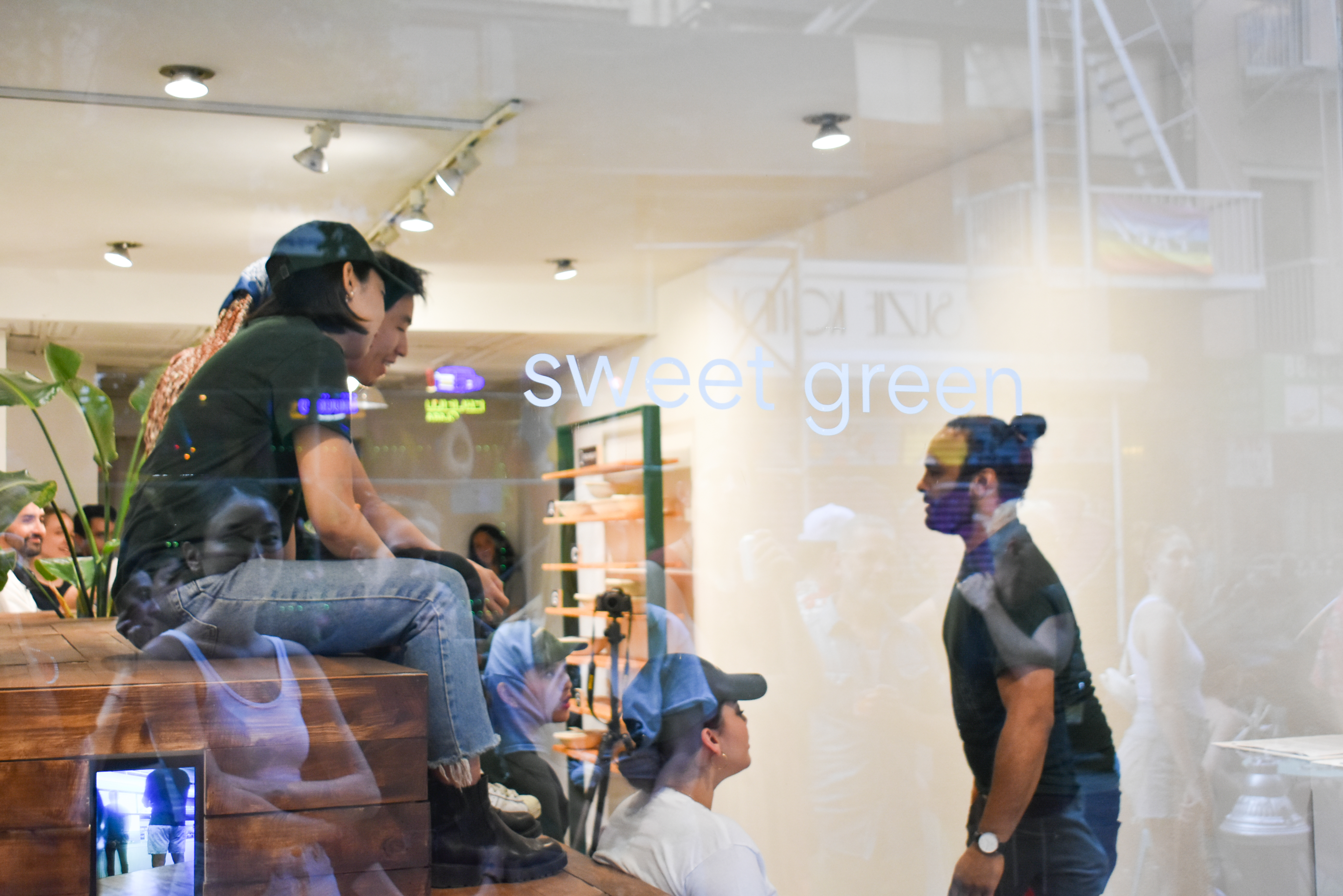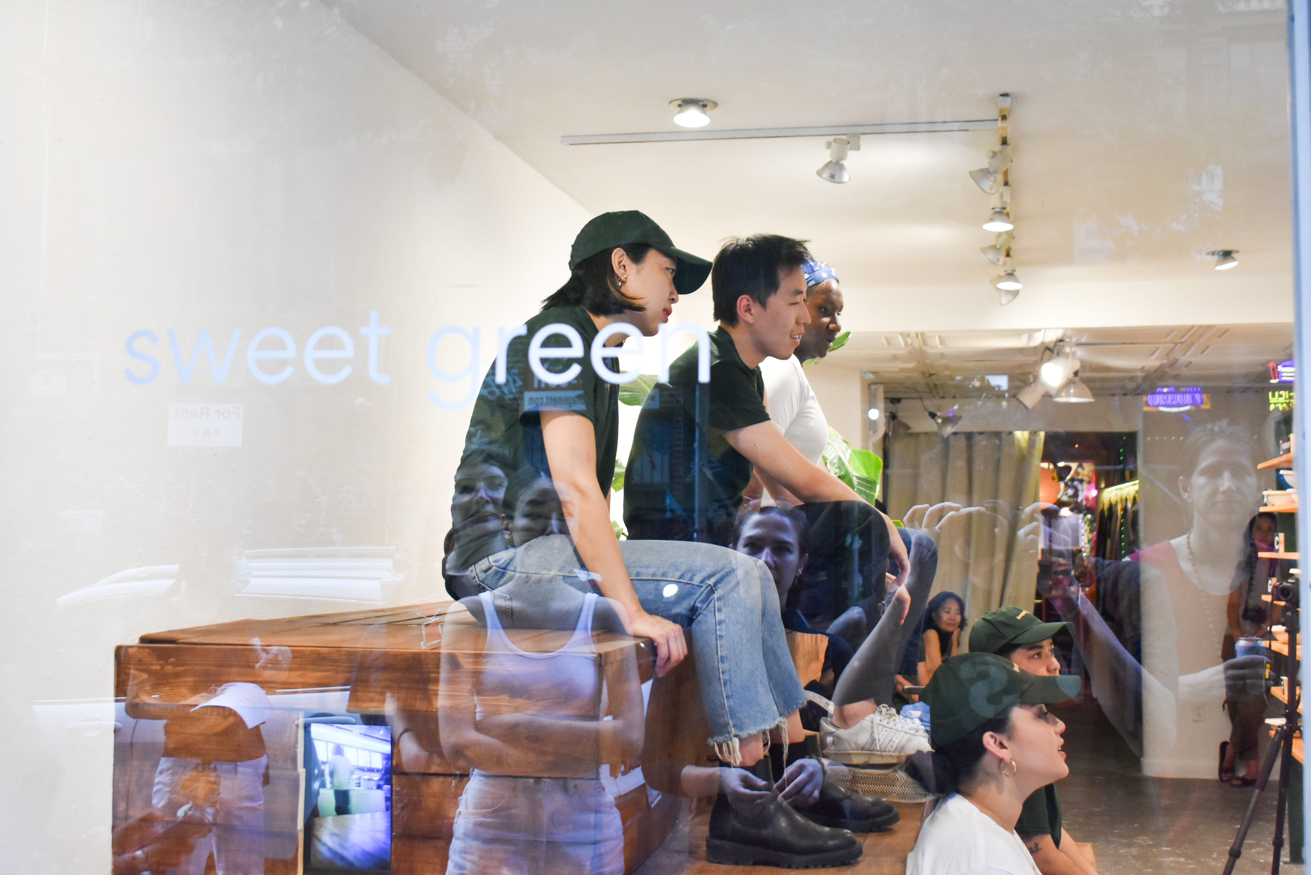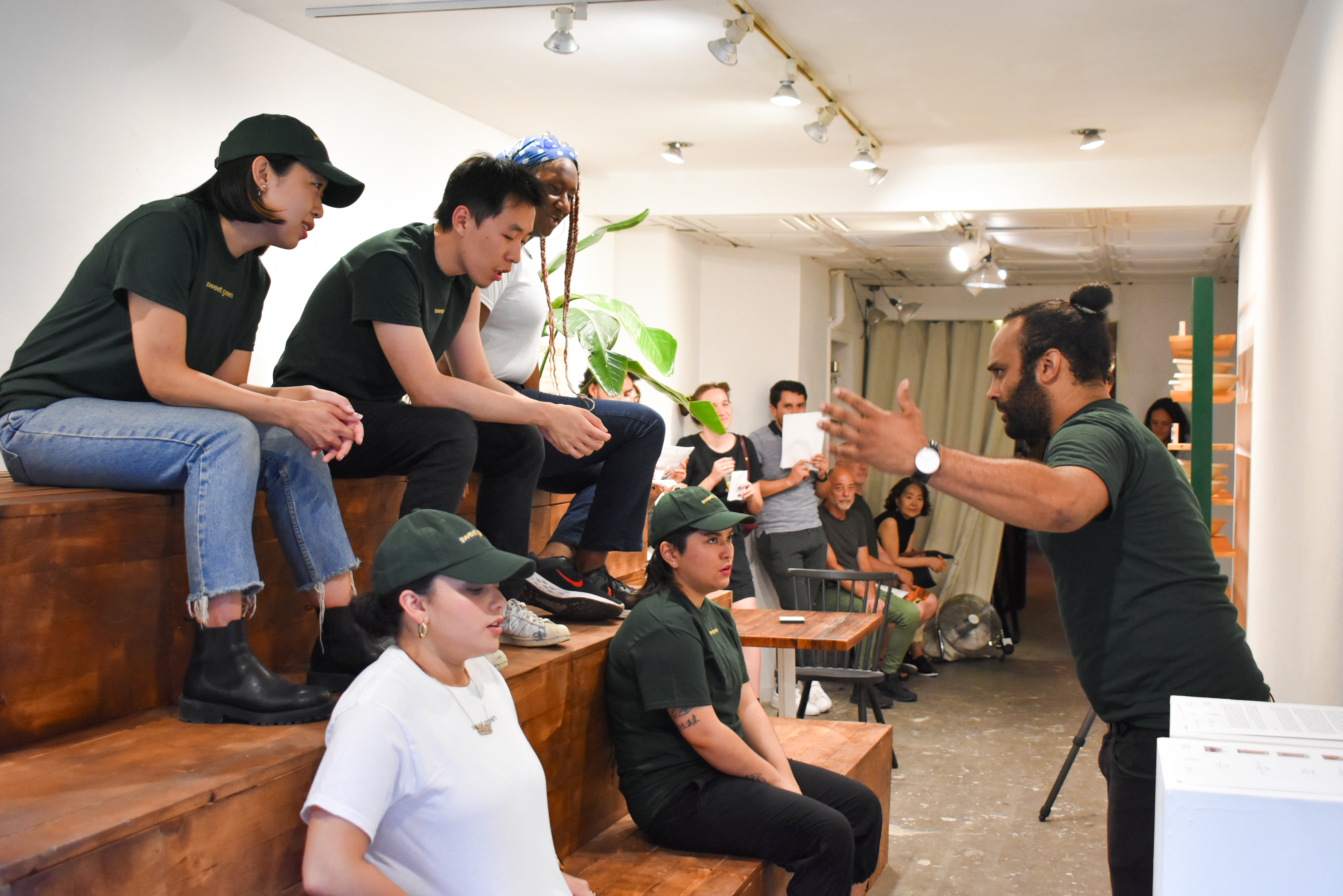 Inside, embedded screens within the seating area streamed surveillance footage from actual Sweetgreen locations. At the opening, performers enacted a call-and-response rendition of the chain’s daily “Sweet Talk” huddle—“Sweet!” “Green!”—repeated for twenty minutes, dramatizing rhythmic corporate pep rituals through vocal exhaustion.