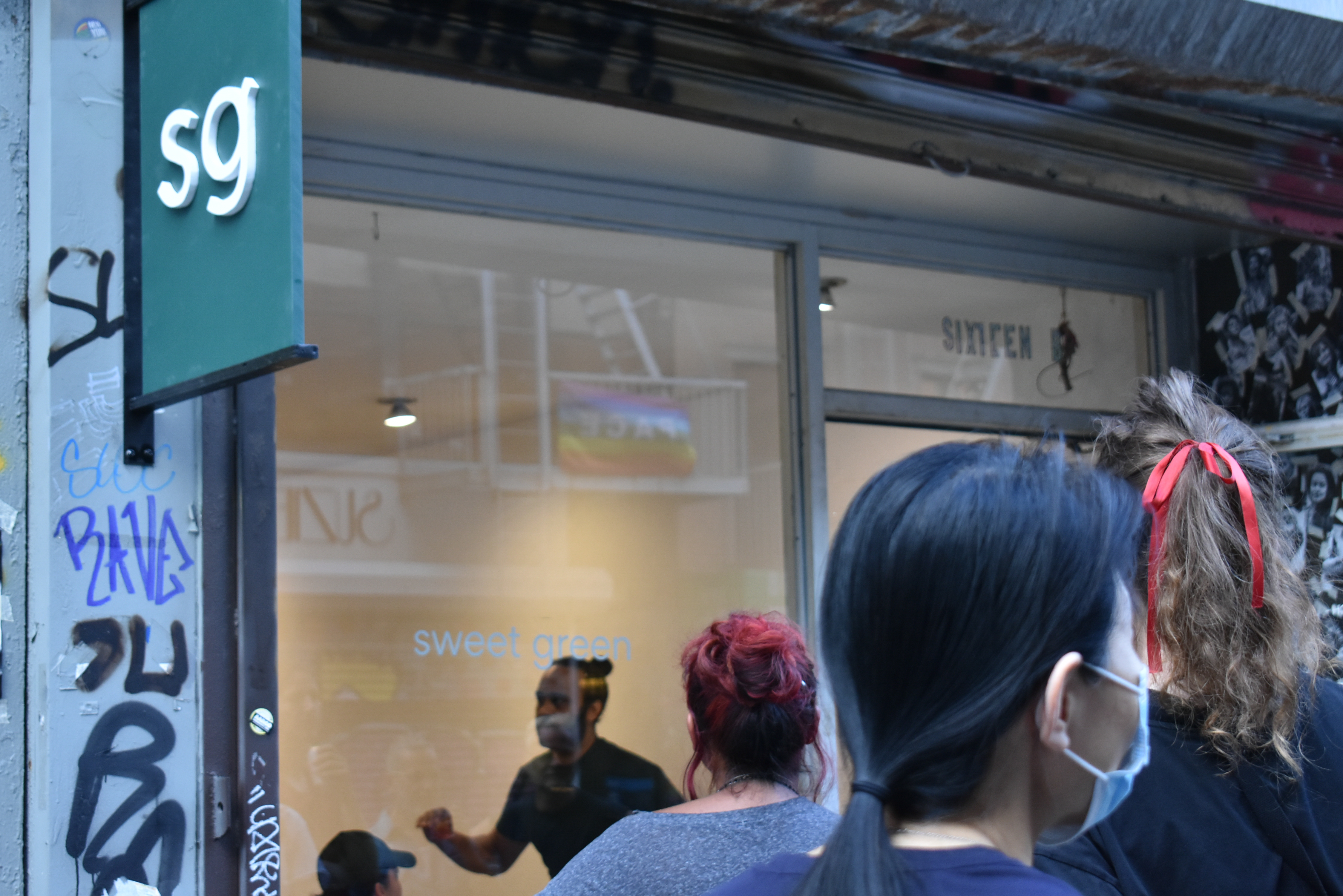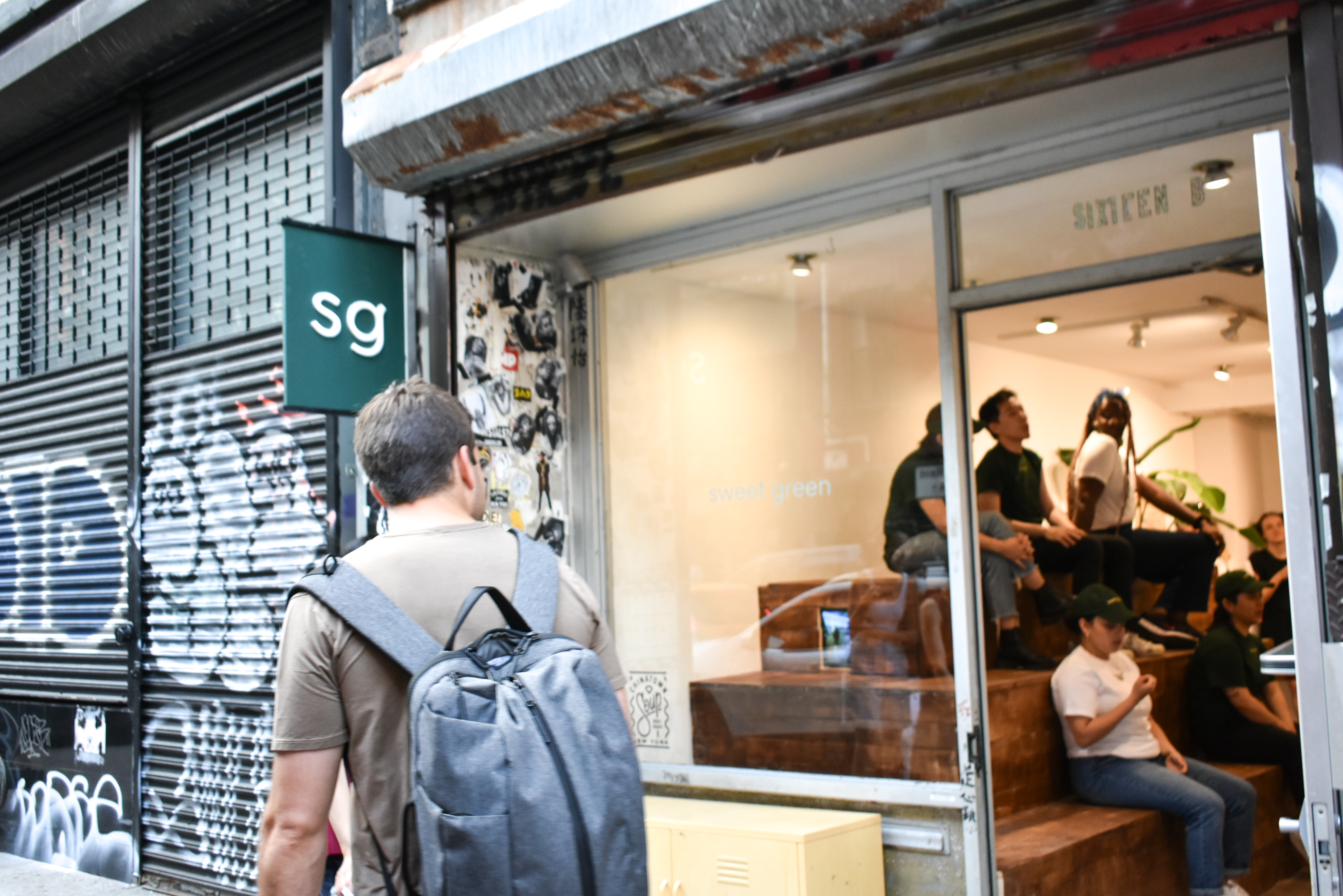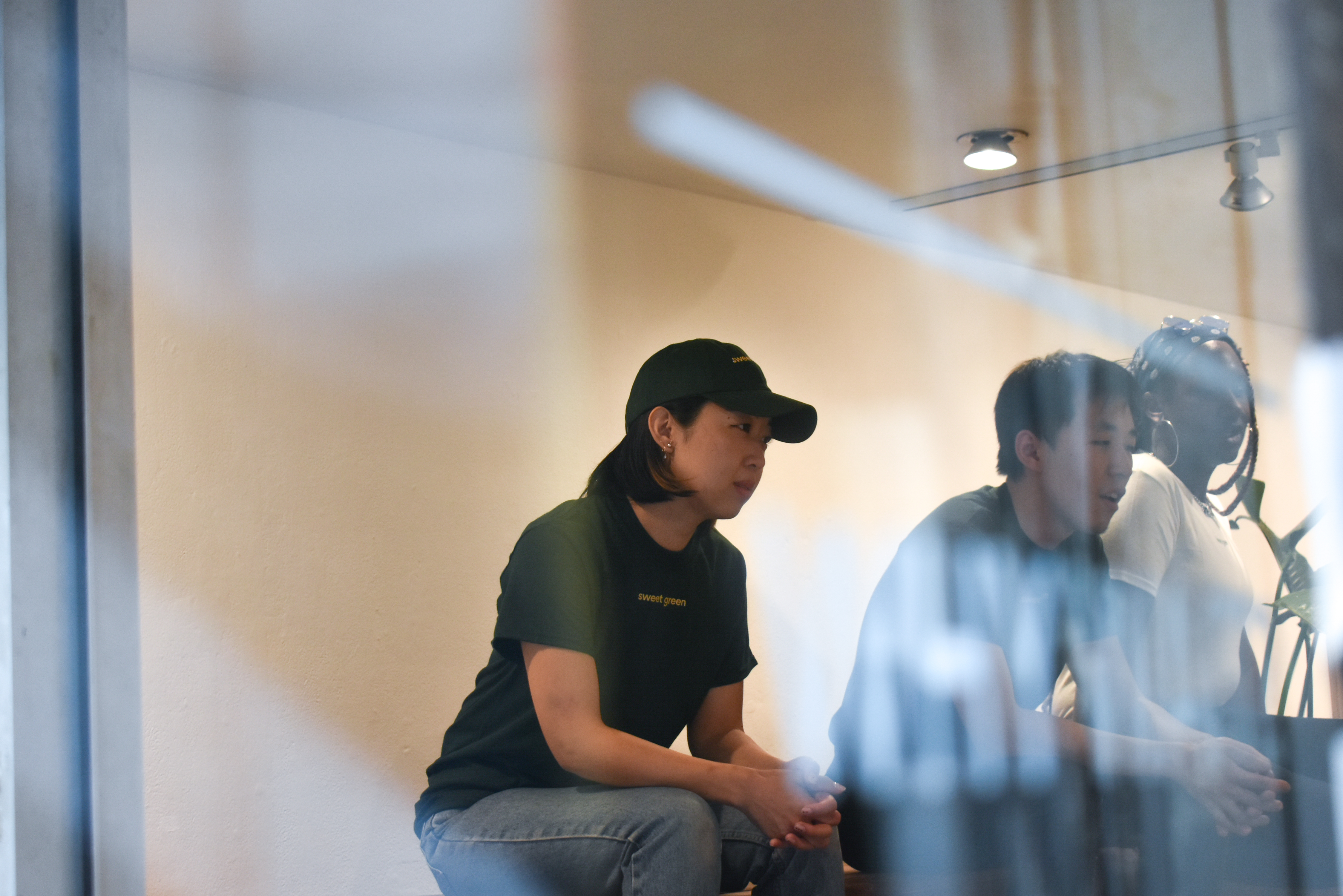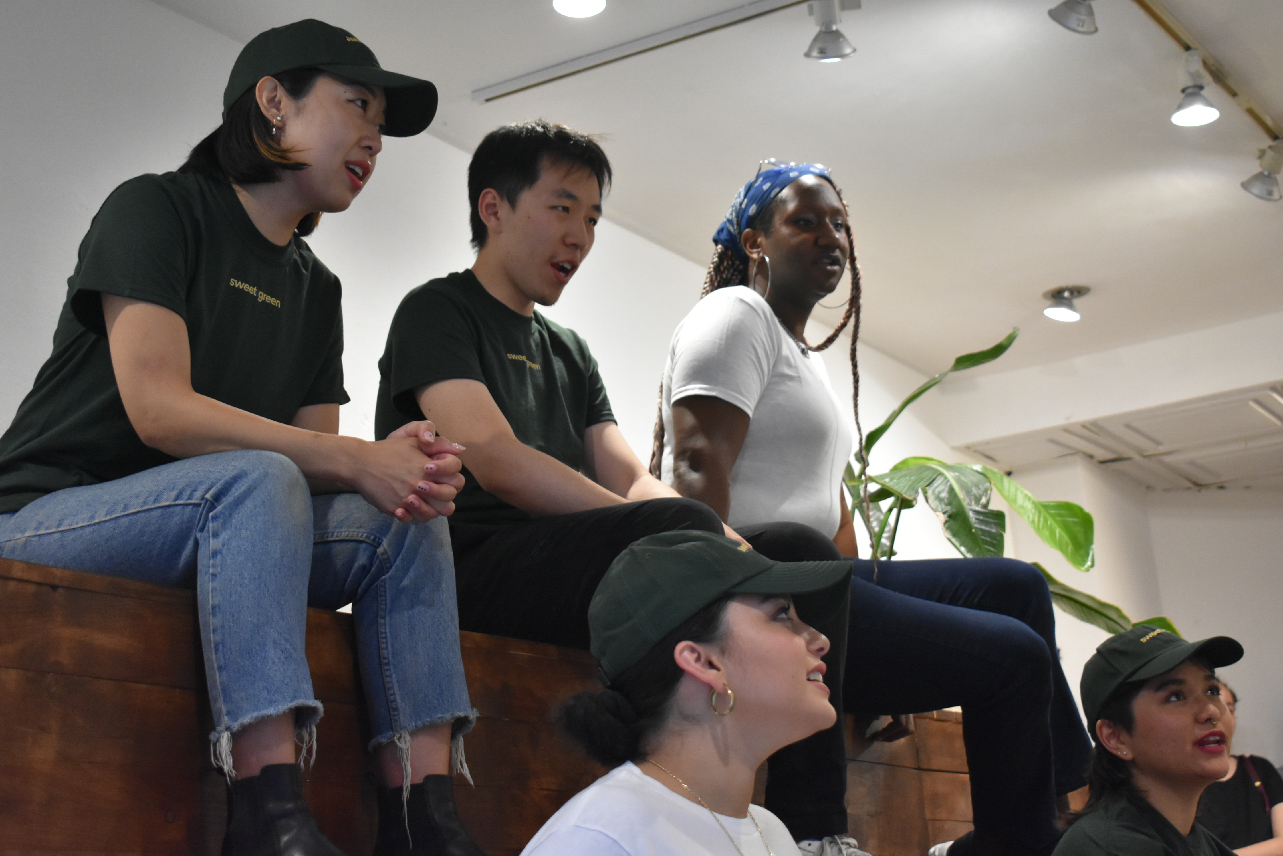 Inside, embedded screens within the seating area streamed surveillance footage from actual Sweetgreen locations. At the opening, performers enacted a call-and-response rendition of the chain’s daily “Sweet Talk” huddle—“Sweet!” “Green!”—repeated for twenty minutes, dramatizing rhythmic corporate pep rituals through vocal exhaustion.