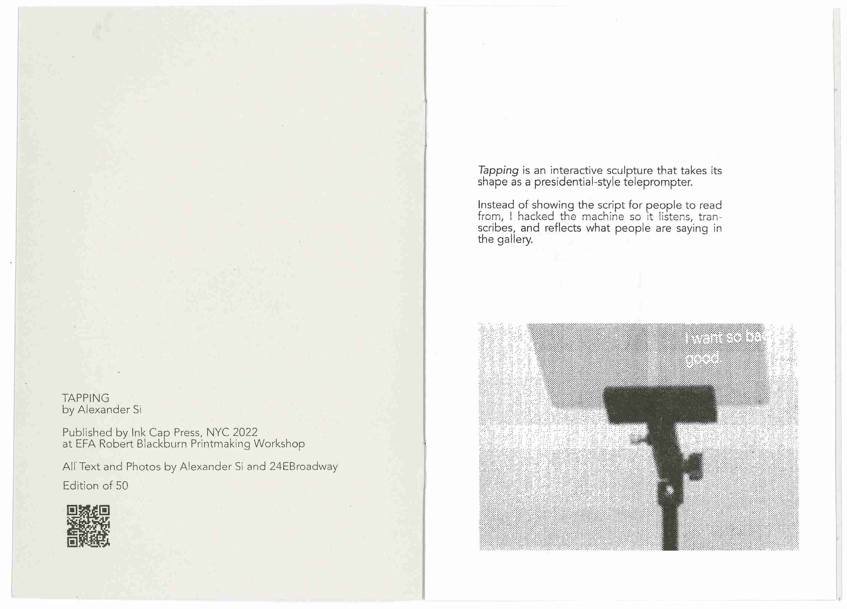 TAPPING IS AN INTERACTIVE SCULPTURE THAT TAKES ITS SHAPE AS A PRESIDENTIAL-STYLE TELEPROMPTER. INSTEAD OF SHOWING THE SCRIPT FOR PEOPLE TO READ FROM, I HACKED THE MACHINE SO IT LISTENS, TRANSCRIBES, AND REFLECTS WHAT PEOPLE ARE SAYING IN THE GALLERY.
